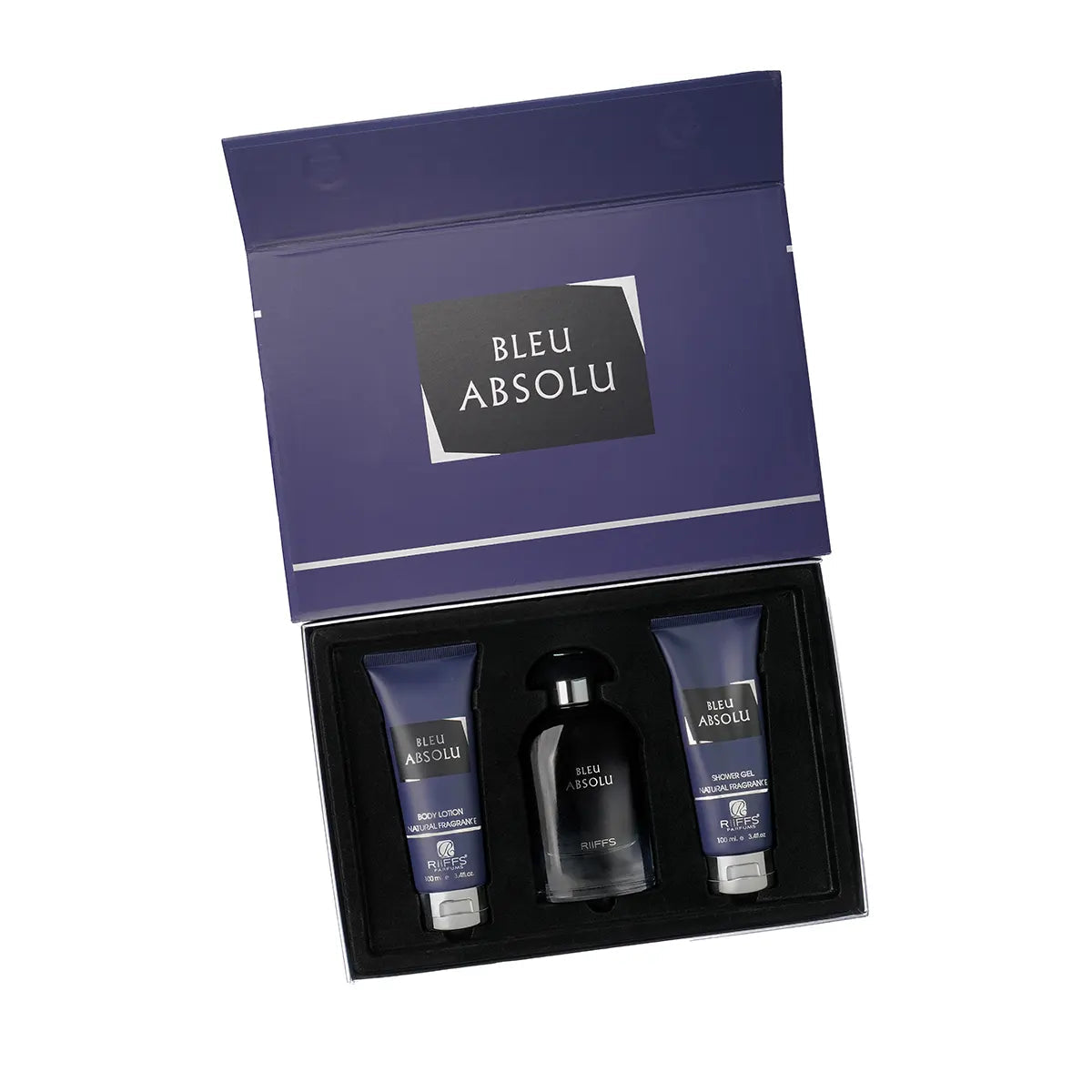 Estuche de regalo de lujo Bleu Absolu con perfume de 100 ml, gel de ducha de 100 ml y loción de 100 ml.