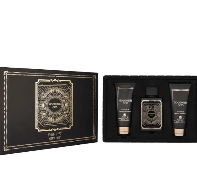 Estuche de regalo de lujo Goodness Oud con perfume de 100 ml, gel de ducha de 100 ml y loción de 100 ml.
